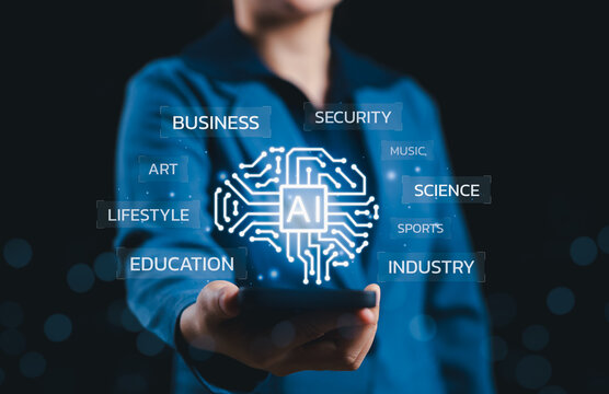 Artificial Intelligence (AI) concept with digital brain circuitry icon and sectors like business, science, education, industry, symbolizing AI's integration across multiple domains and technologies.
