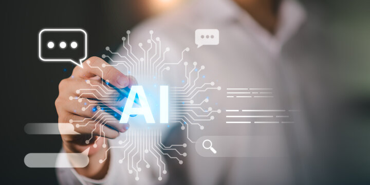 Business man Finger touch AI icon about business data and more, Symbolizing advanced technology integration in business solutions data, Artificial Intelligence, Futuristic technology transformation