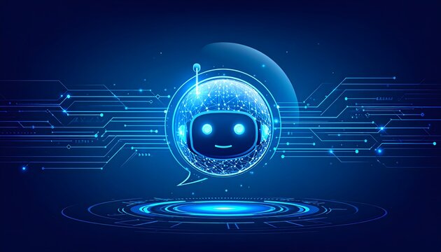 Blue AI Chatbot Assistant Icon on Digital Circuit Background. Artificial Intelligence, Machine Learning, Technology & Future Concept.