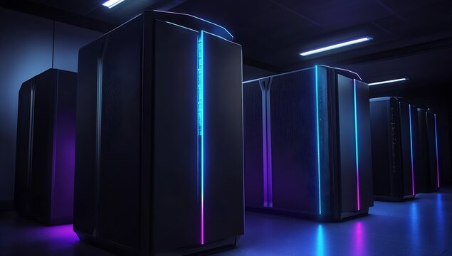 Columns of Artificial Intelligence AI supercomputer racks with glowing lights in a dark room for a futuristic and impressive digital atmosphere generative AI