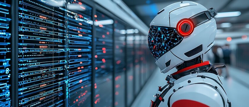 Futuristic robot observing server racks