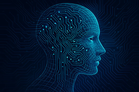 Abstract artificial intelligence human head profile with futuristic circuit board pattern and network connections in dark blue background