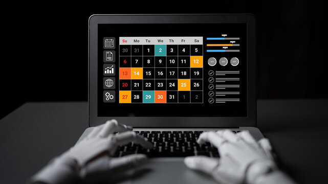 A sleek laptop showcases a vibrant calendar and various productivity tools, while robotic hands type efficiently on a dark workspace, emphasizing innovation in digital planning. Gantry