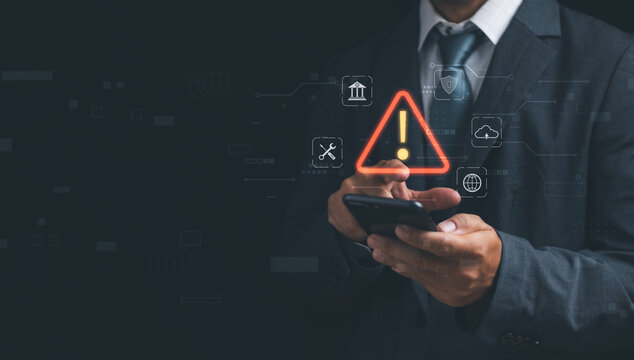 Problem and error warning concept. Working on computer laptop with triangle caution warning sign, warning system for notification error and maintenance. Incident, risk, contingency management.