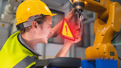 Professional and intelligence engineers used technical hard skill to fix, repair or maintenance an error system machine robotic arm in factory or industrial, examining or welding automobile workshop