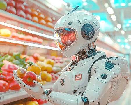 A white robot navigates a pharmacy aisle, passing rows of shelves stocked with bottles.