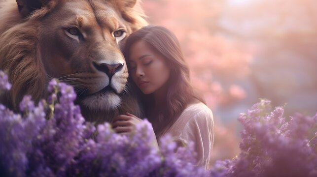 Beautiful Asian woman hugging, caring a lion, sunset mountain landscape, freedom. exotic, surreal, wild, cold, ethnic., flowers, mystic, copy space, AI Generated.