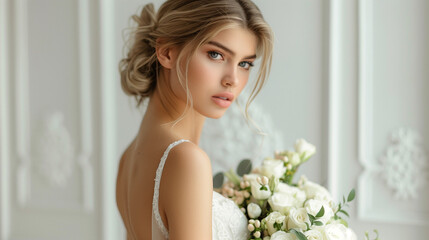 Elegant beautiful lady bride in lace gown with floral details