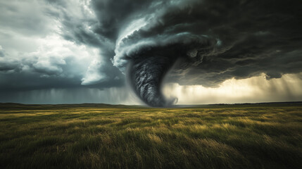 Tornado storm, seen from a distance with giant whirlwind in the middle of a vast grassland, dark black storm clouds rolling in the sky, Ai generated images