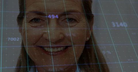 Smiling senior professional with augmented analytics grid overlay closeup headshot