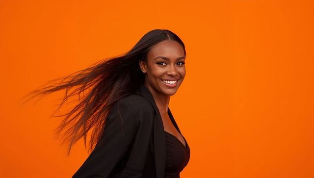 Confident black woman smiling in blazer with flowing hair on orange background headshot