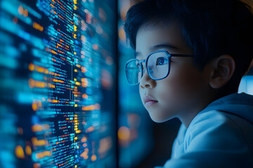 IT young primary school student studying at computer learning digital code in data and online software ai cyber security threats