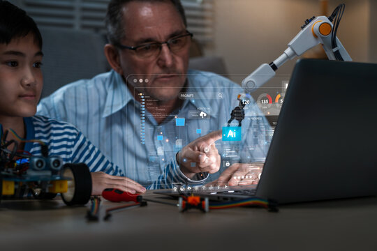 Asian elementary school students learning with teacher doing homework project about robotic arm. STEM learning concept using computers and coding. Robot programming technology.