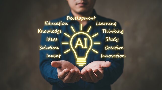 A man holds a glowing lightbulb with the letters AI inside surrounded by words like Education Learning Ideas and Innovation representing the concept of artificial intelligence Technology