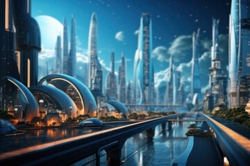 A futuristic cityscape with luminescent skyscrapers, envisioning the integration of sustainable lighting in urban architectural designs. Generative Ai.