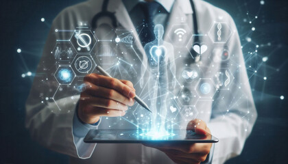 A Doctor In A White Lab Coat with a Stethoscope Is Holding A Tablet, Using A Stylus To Work with Healthcare Advanced Technology Like Artificial Intelligence, Augmented Reality, Digital Holographic.