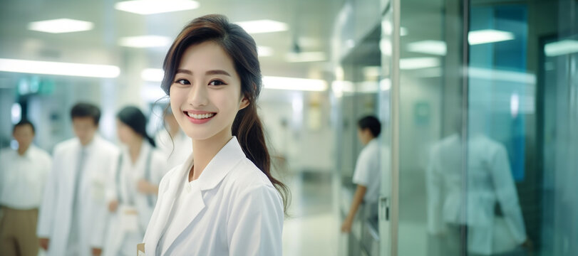 Photo of young woman doctor smiling for the camera. generative ai