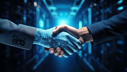 Handshake between AI and businessman, ready to work as a team on the future of Artificial Intelligence in language models and machine learning.