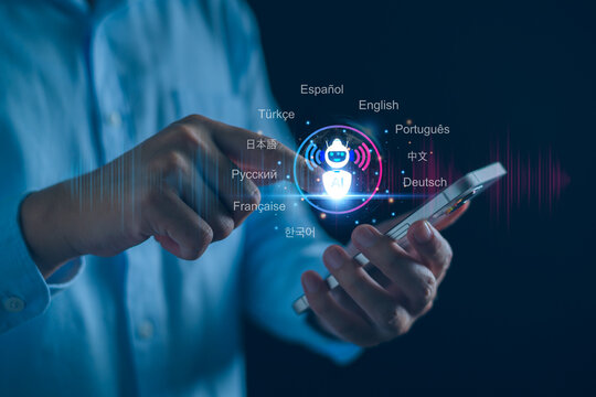 Multilingual Language Translation, Communication Concept. Man using phone with icons various languages, global language translate, multilingual technology, international connections, AI translator,