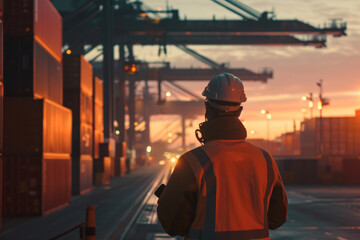 Logistics truck driving through port, symbolizing AI powered demand forecasting with digital brain overlay. scene conveys innovation