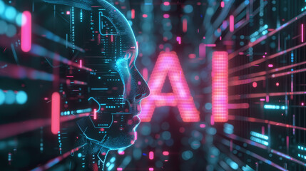 Futuristic Artificial Intelligence: Holographic Profiles, Glowing Data Streams, and Cybernetic Human Faces with Neon Lights and Circuitry