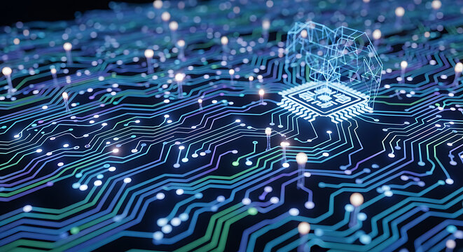 Futuristic circuit board with glowing technology microchips