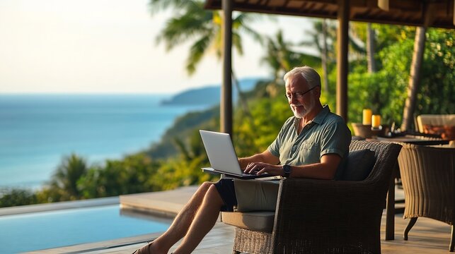 White humanoid robot working on laptop with financial graphs at beach, futuristic AI nomad lifestyle and remote job freedom