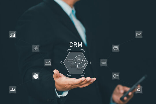 Businessman presenting  AI powered CRM interface with customer analytics, support icons, and data driven tools, illustrating smart customer management, automation workflow, and modern business tech.
