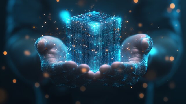 3D wireframe hands presenting a glowing AI semiconductor hologram on a soft blue technology background, highlighting elegance, innovation, and minimalistic reflections.