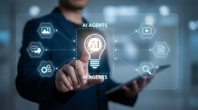a man in a suit interacts with a holographic display featuring artificial intelligence icons and a glowing lightbulb representing innovative ai agents