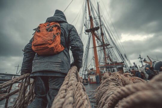 Sailor with Orange Pack on Tall Ship Ropes During Overcast Weather