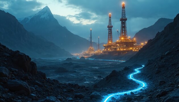 Futuristic mining operation in rocky landscape with advanced technology. Oil rigs glow with bright lights against moody sky. Neon blue line traces path through terrain, energy data transfer.
