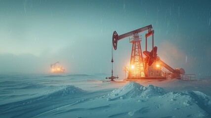 Large oil drilling rigs extract crude oil from the frozen terrain, surrounded by swirling snow and low visibility, at twilight. Equipment glows against the bleak environment.