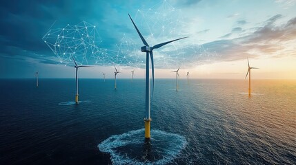 Digital twin of offshore wind farm managed by AI simulating weather impacts, power yield forecasts, and turbine maintenance schedules for optimal output