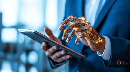 Innovative robotic hand assisting business professional modern office digital interaction tech environment close-up viewpoint