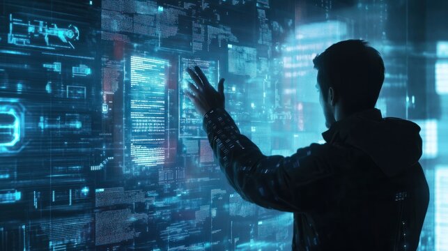man touch ai auto chat bot. Big data center storage.Digital Artificial Intelligence technology disruption concept. We are implementing storage technology support and service in the business.