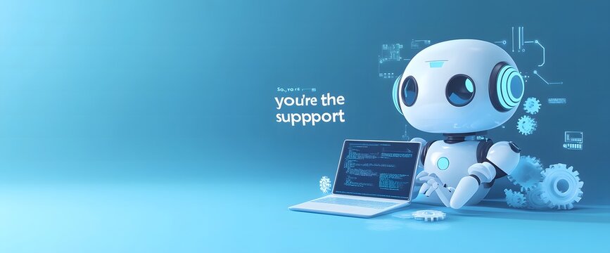 An engaging image of a robot AI assistant offering support, depicted with floating gears and a high-tech laptop interface