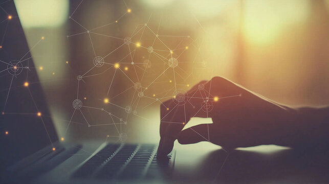 Hands typing on a laptop with glowing ai text overlay and digital data streams