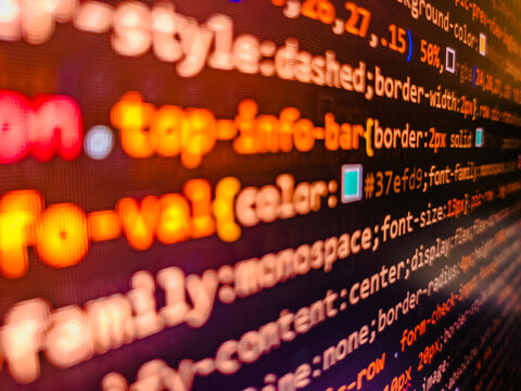 Data in binary code. Closeup of Java Script and HTML code. Program. Programmer occupation job. Business and AI technology represent learning process