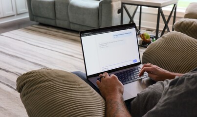 African american male checking web AI chatbot responses for some tasks, working after hours to meet business objectives. Problem solving with futuristic tech and machine learning.