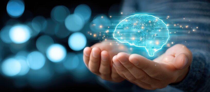A digital brain hovers gently in the hands of a person, glowing with a light blue digital aura