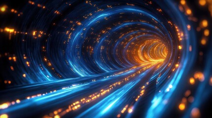 Futuristic Digital Tunnel of Flowing Light in Blue and Gold with High Speed Binary Data and Technology Visualization