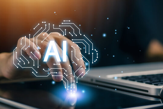Business professional interacting with AI digital interface, representing artificial intelligence, machine learning, smart technology, automation, and future business innovation.