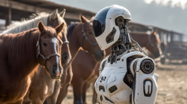 A humanoid robot standing among horses in a stable, a concept of artificial intelligence in agriculture and animal care