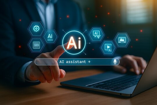 A professional typing on a laptop with a glowing AI interface graphic, representing artificial intelligence, machine learning, smart automation, and advanced digital innovation in modern business.