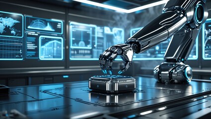 Robotic Arm Assembling High-Tech Gadget in Advanced Lab with Digital Interfaces