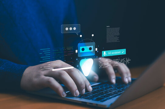 AI assistant and chatbot concept on laptop, showing digital robot interaction, automation, smart technology for customer support, business solutions, and virtual communication chatbot and virtual