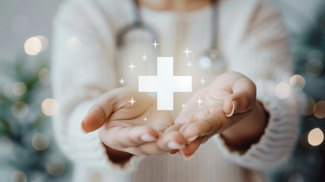 Close-up of hands holding a red first aid kit with a white cross symbol representing medical emergency care and preparedness