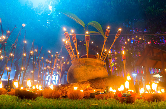 Conceptual traditional Malay torch and lamp and decorative ketupat during Hari Raya Aidilfitri celebration