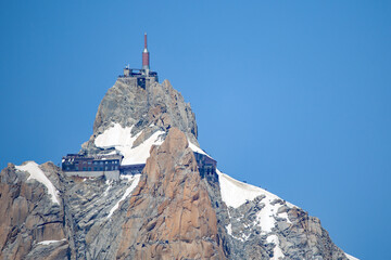 view from below of the station aiguille du midi on the mountain with a clear blue sky and sunshine